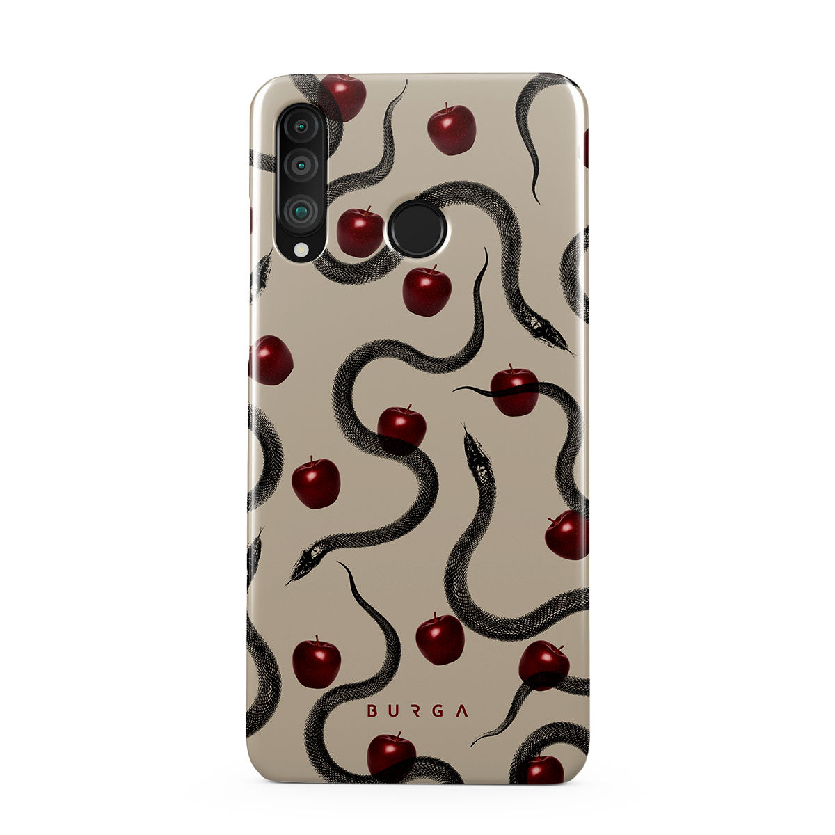 Este design contém: maçãs vermelhas brilhantes, serpentes enroladas, tons de bege.