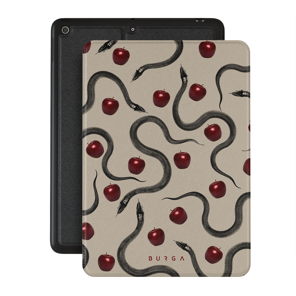 Este design contém: maçãs vermelhas brilhantes, serpentes enroladas, tons de bege.