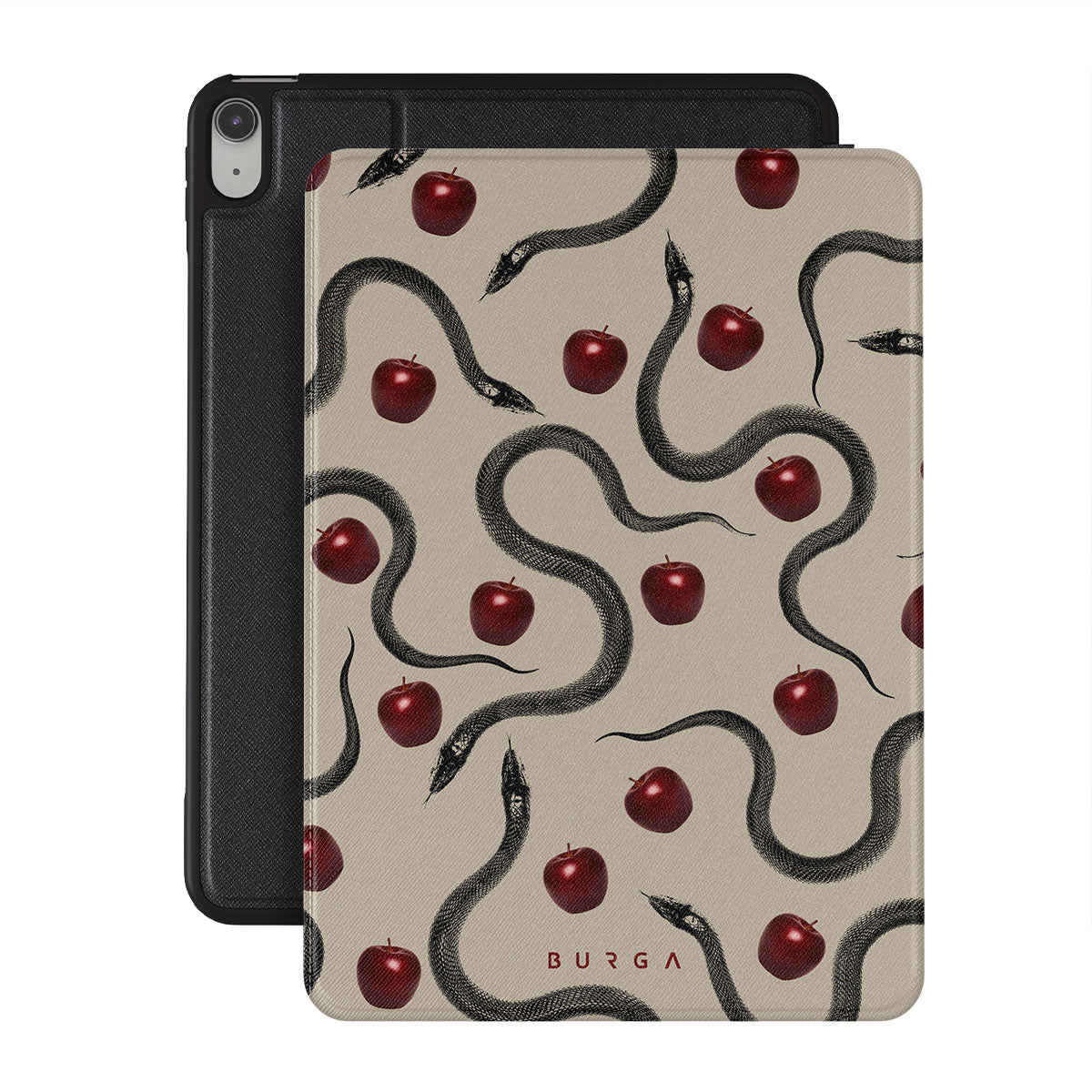 Este design contém: maçãs vermelhas brilhantes, serpentes enroladas, tons de bege.