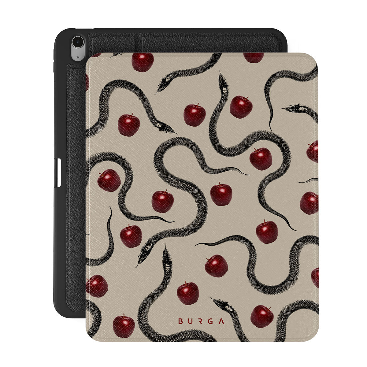 Este design contém: maçãs vermelhas brilhantes, serpentes enroladas, tons de bege.