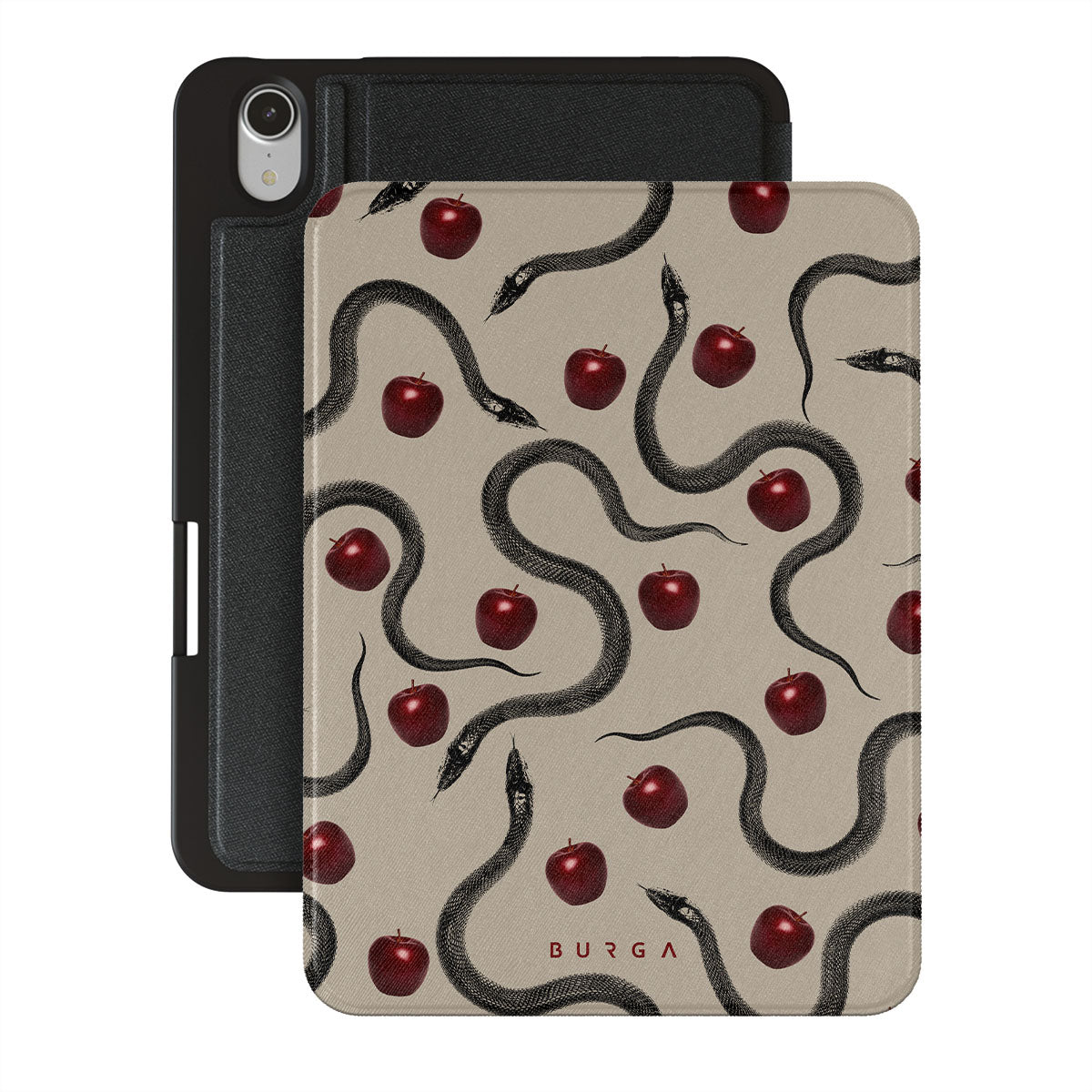 Este design contém: maçãs vermelhas brilhantes, serpentes enroladas, tons de bege.