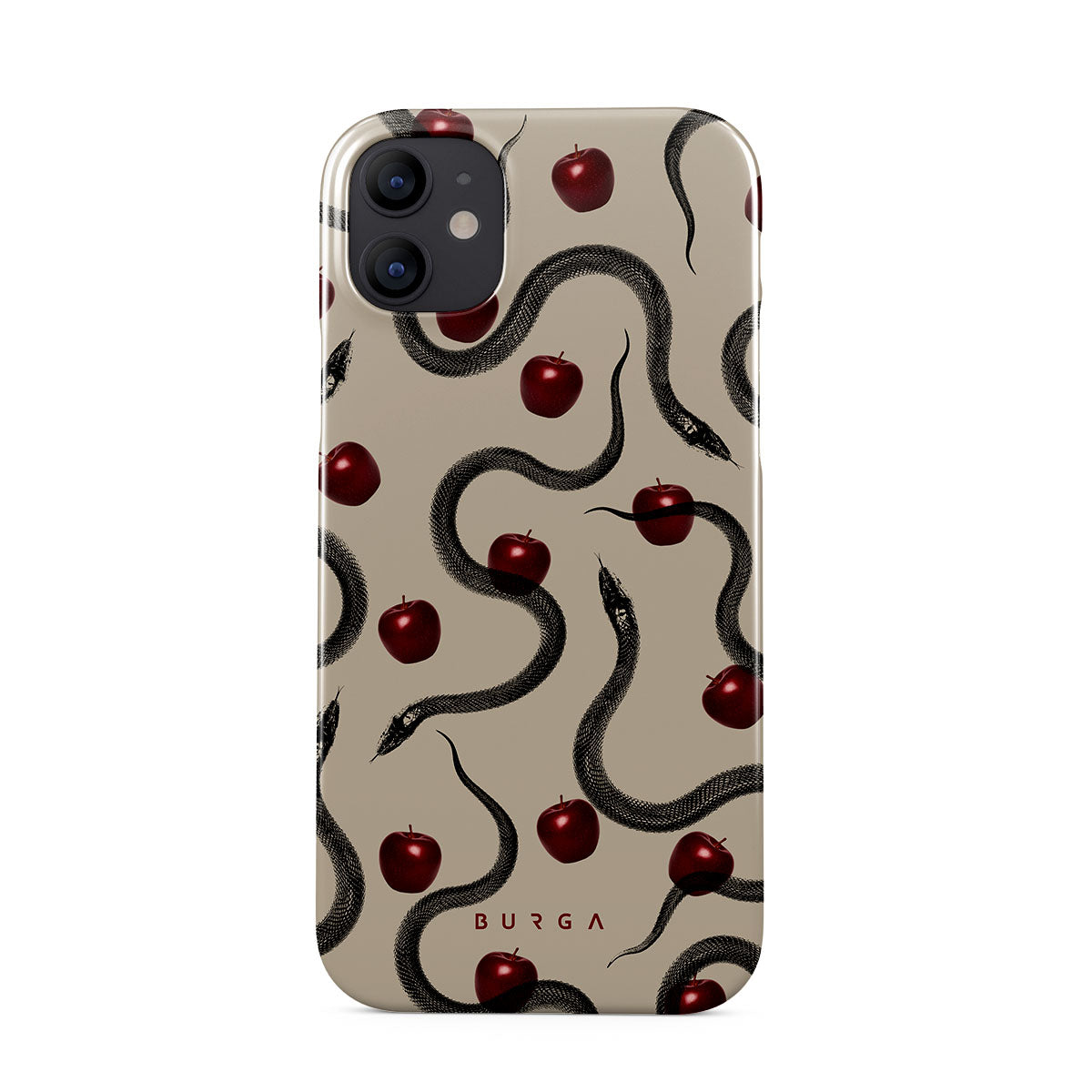 Este design contém: maçãs vermelhas brilhantes, serpentes enroladas, tons de bege.