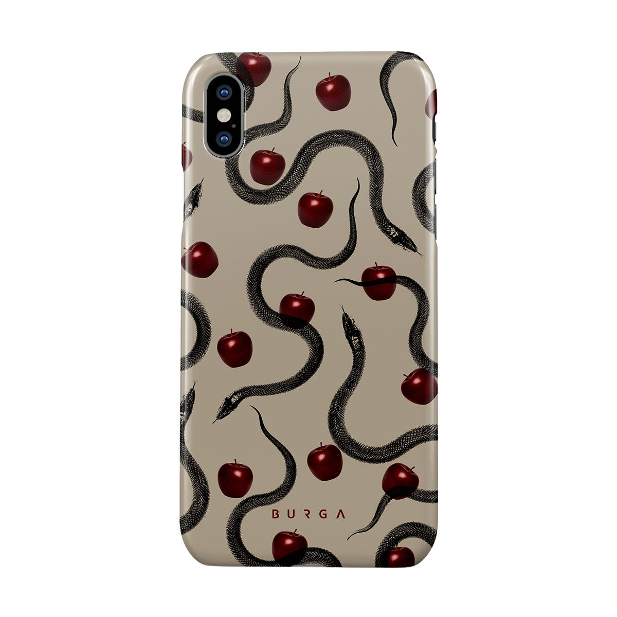 Este design contém: maçãs vermelhas brilhantes, serpentes enroladas, tons de bege.