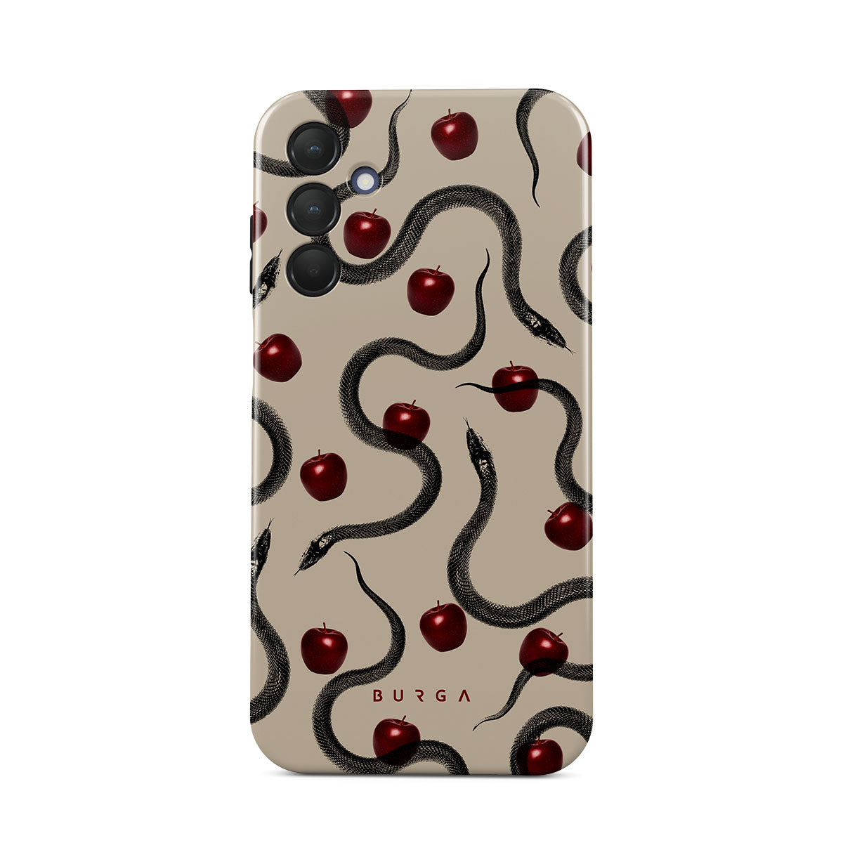 Este design contém: maçãs vermelhas brilhantes, serpentes enroladas, tons de bege.