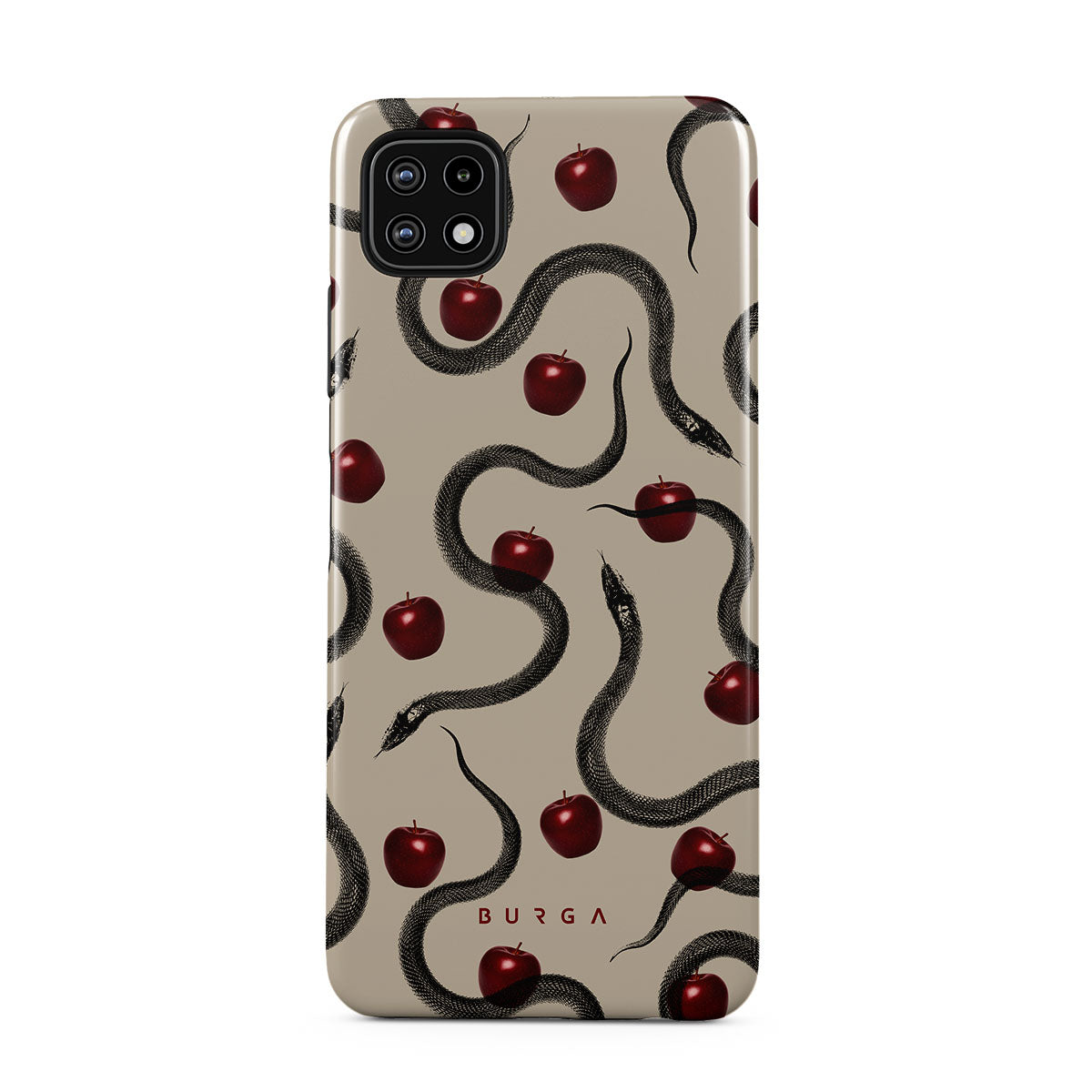 Este design contém: maçãs vermelhas brilhantes, serpentes enroladas, tons de bege.