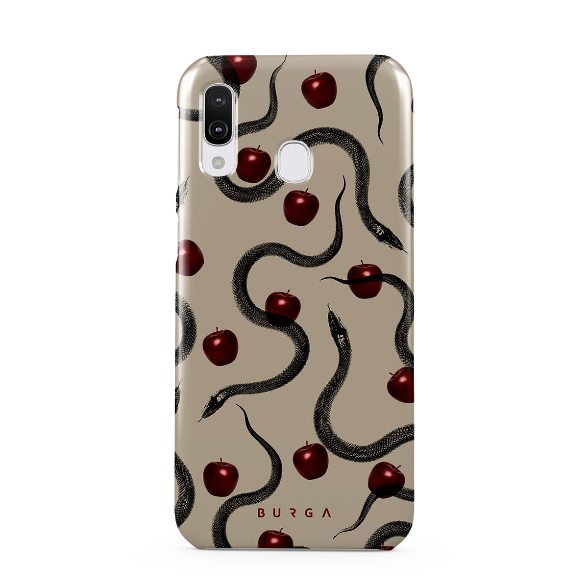 Este design contém: maçãs vermelhas brilhantes, serpentes enroladas, tons de bege.