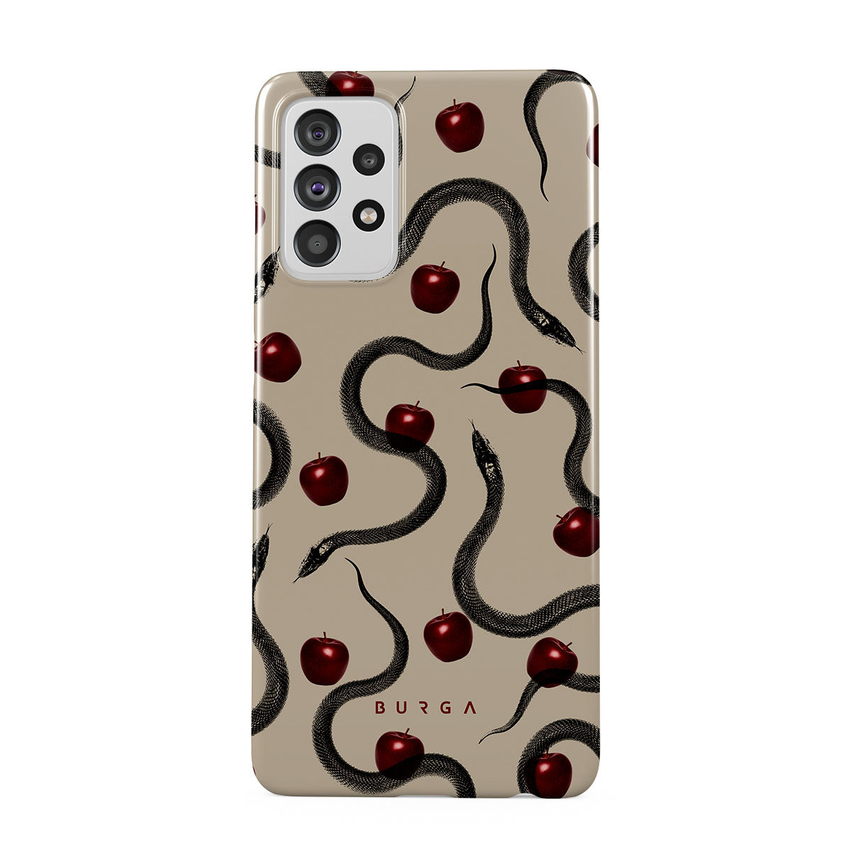 Este design contém: maçãs vermelhas brilhantes, serpentes enroladas, tons de bege.