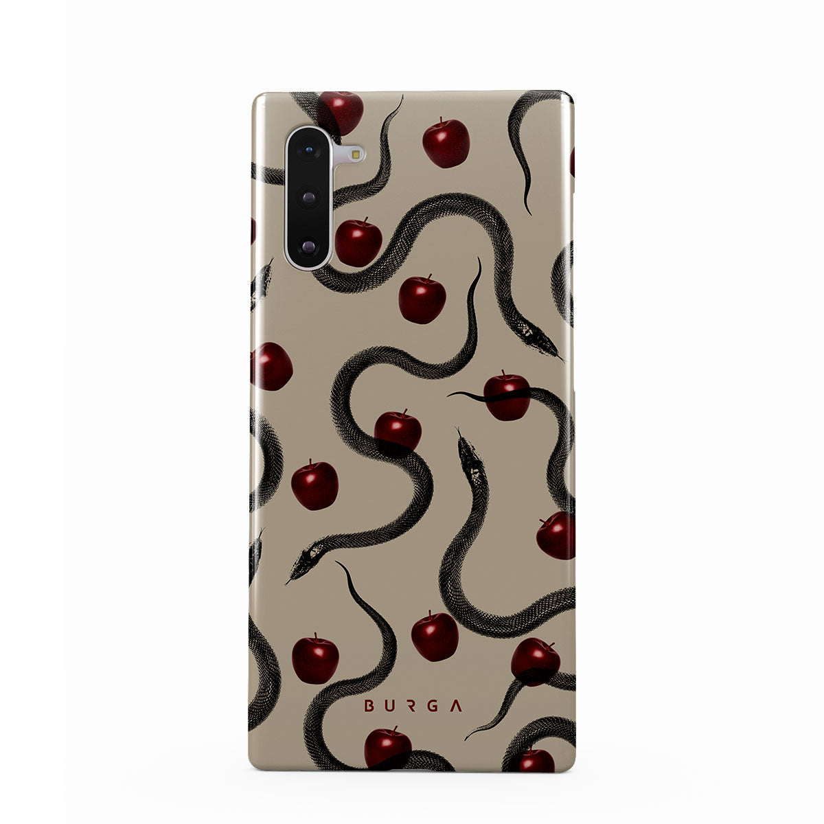 Este design contém: maçãs vermelhas brilhantes, serpentes enroladas, tons de bege.