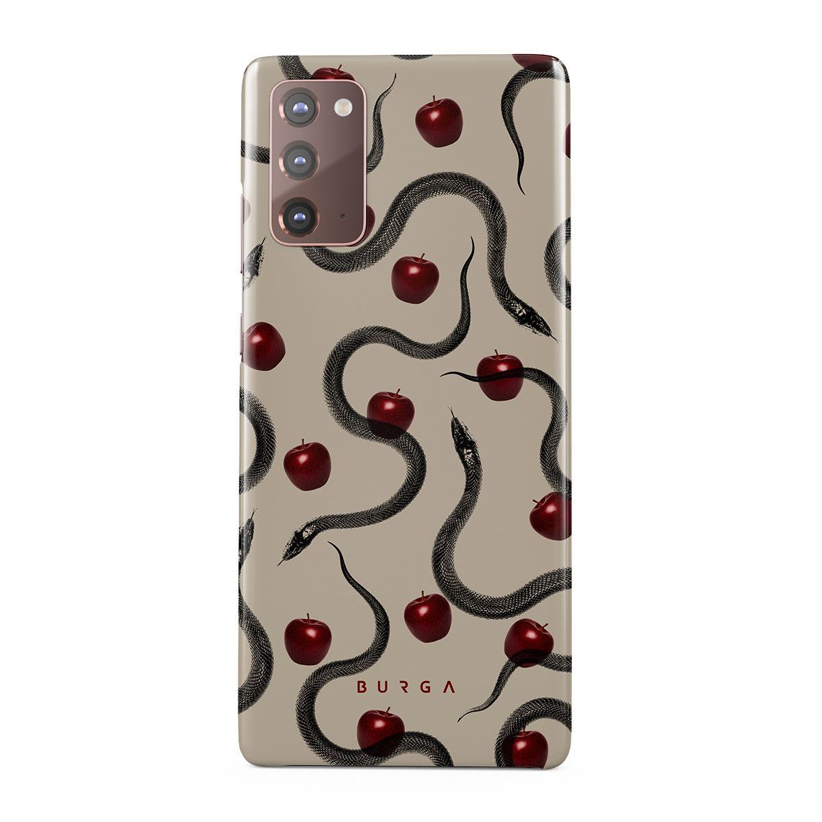 Este design contém: maçãs vermelhas brilhantes, serpentes enroladas, tons de bege.