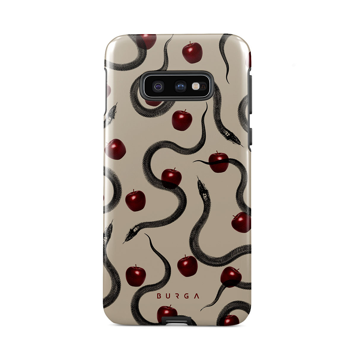Este design contém: maçãs vermelhas brilhantes, serpentes enroladas, tons de bege.