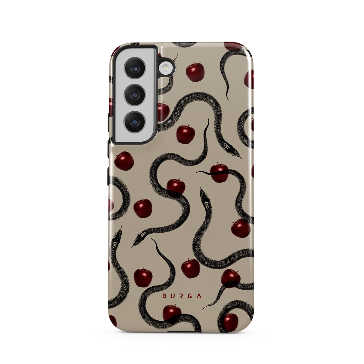 Este design contém: maçãs vermelhas brilhantes, serpentes enroladas, tons de bege.