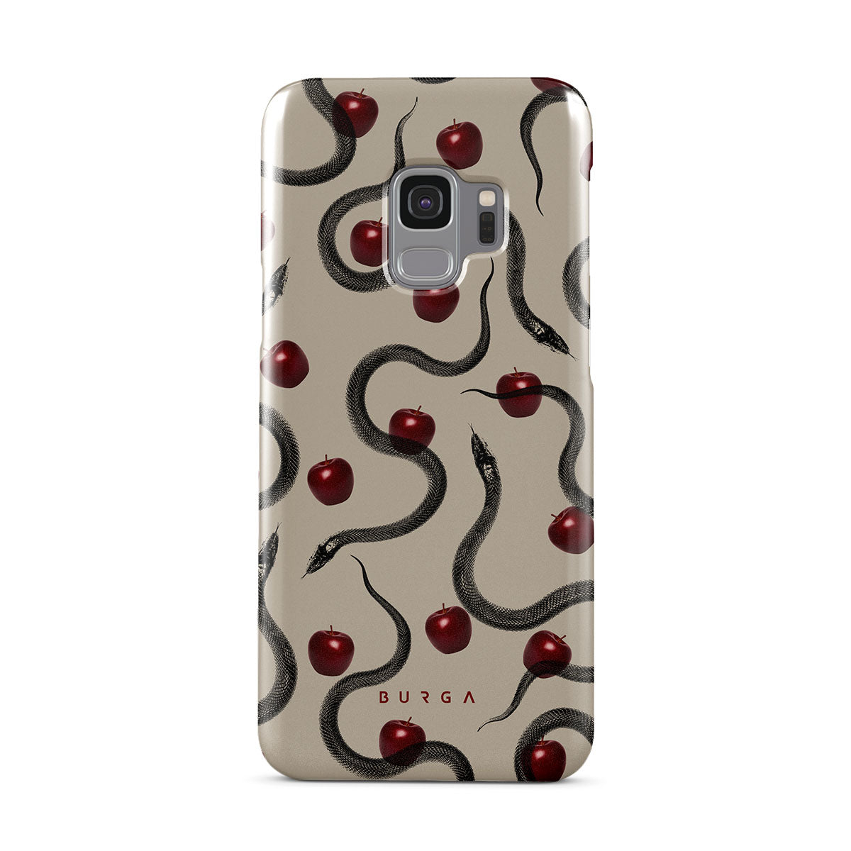 Este design contém: maçãs vermelhas brilhantes, serpentes enroladas, tons de bege.