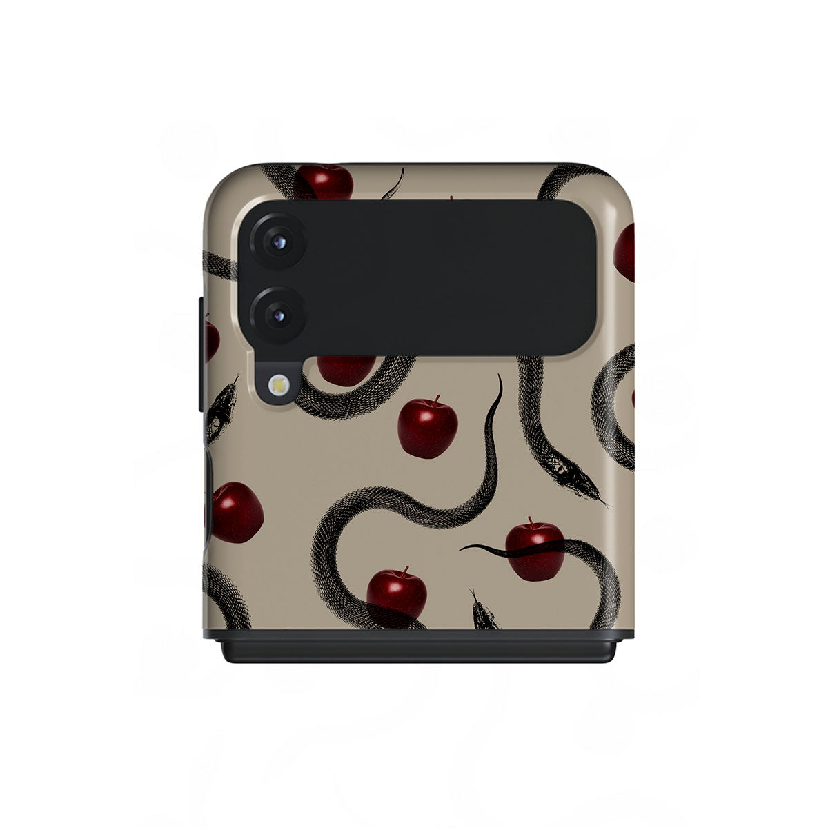 Este design contém: maçãs vermelhas brilhantes, serpentes enroladas, tons de bege.