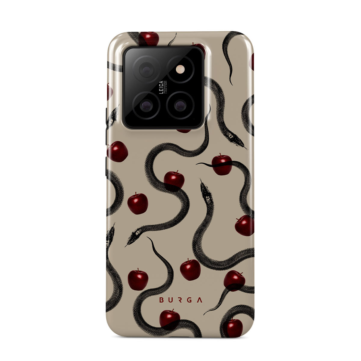 Este design contém: maçãs vermelhas brilhantes, serpentes enroladas, tons de bege.
