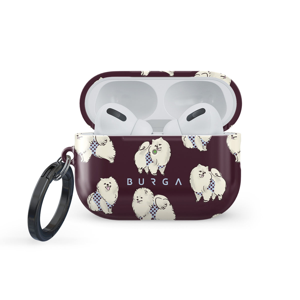 Este design contém: cães brancos fofinhos sobre um fundo bordô escuro, poodles e animais de estimação.