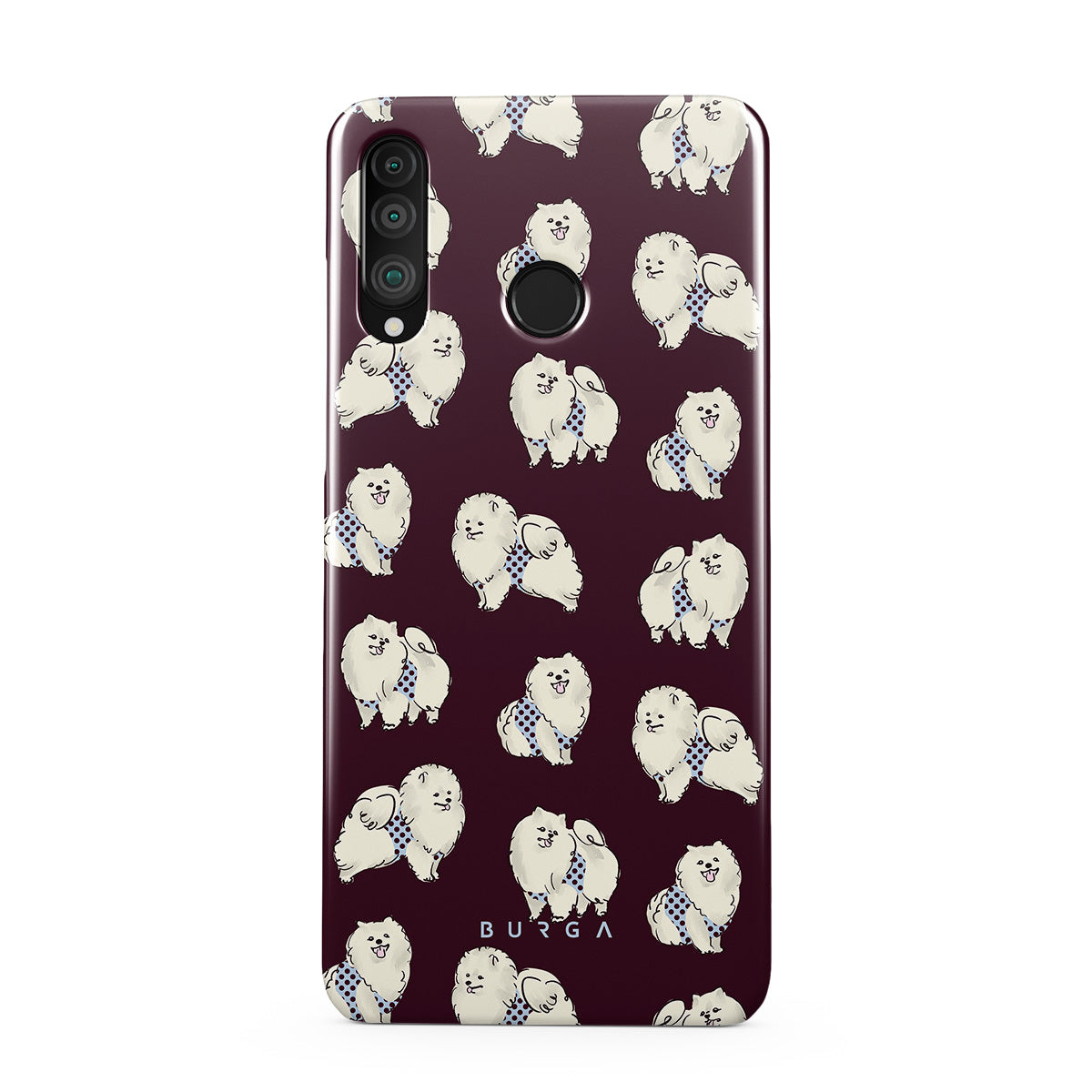 Este design contém: cães brancos fofinhos sobre um fundo bordô escuro, poodles e animais de estimação.