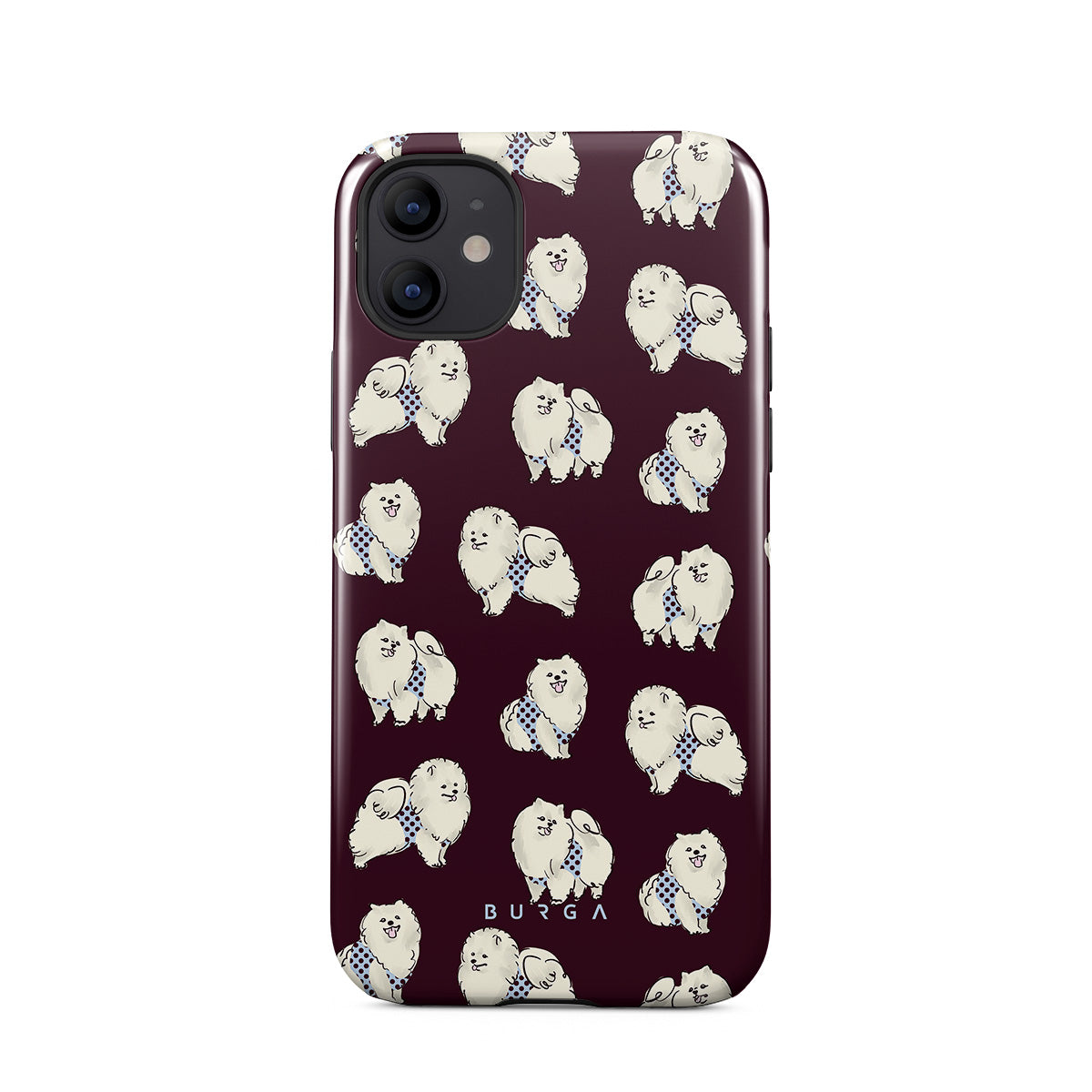 Este design contém: cães brancos fofinhos sobre um fundo bordô escuro, poodles e animais de estimação.