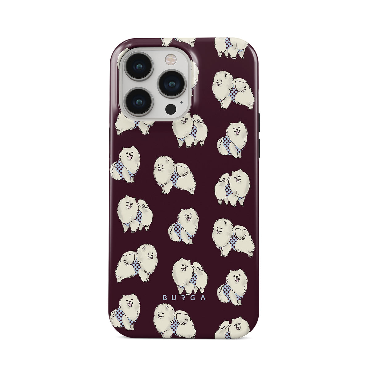 Este design contém: cães brancos fofinhos sobre um fundo bordô escuro, poodles e animais de estimação.