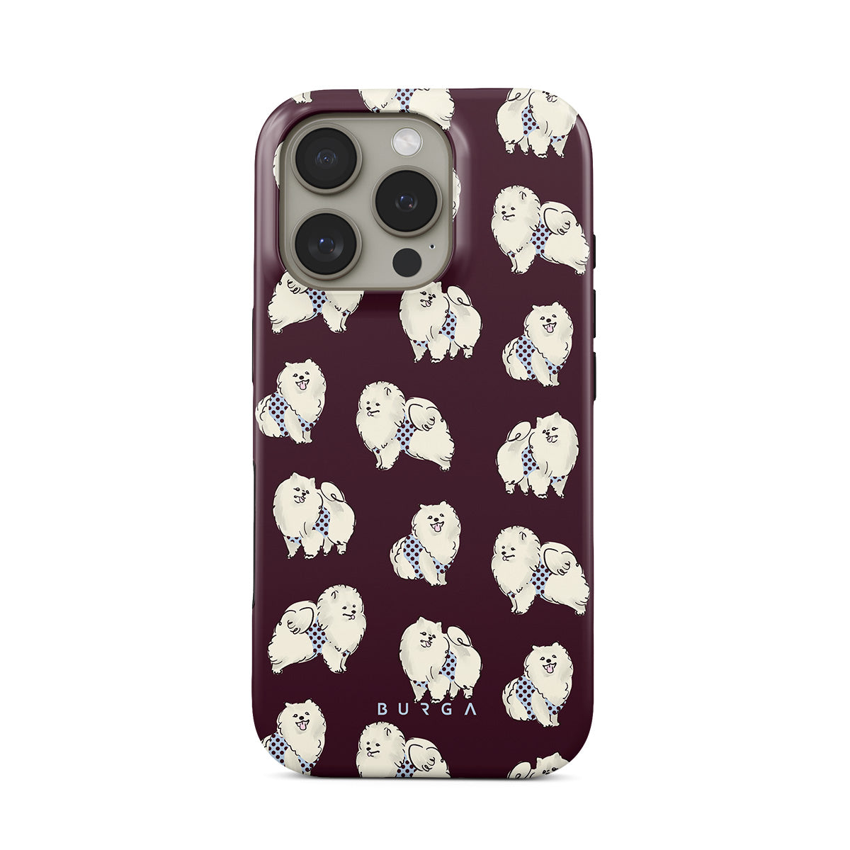 Este design contém: cães brancos fofinhos sobre um fundo bordô escuro, poodles e animais de estimação.