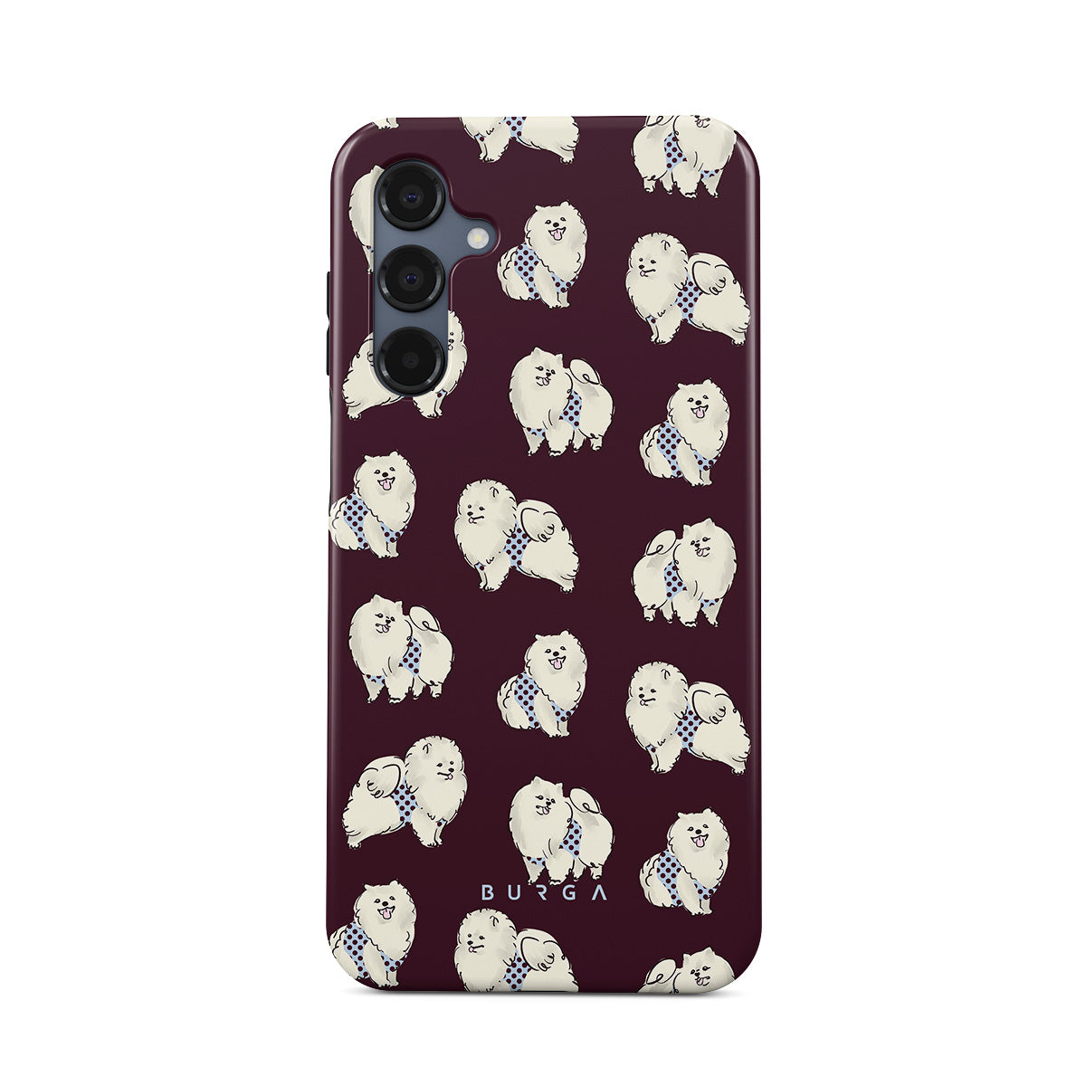 Este design contém: cães brancos fofinhos sobre um fundo bordô escuro, poodles e animais de estimação.