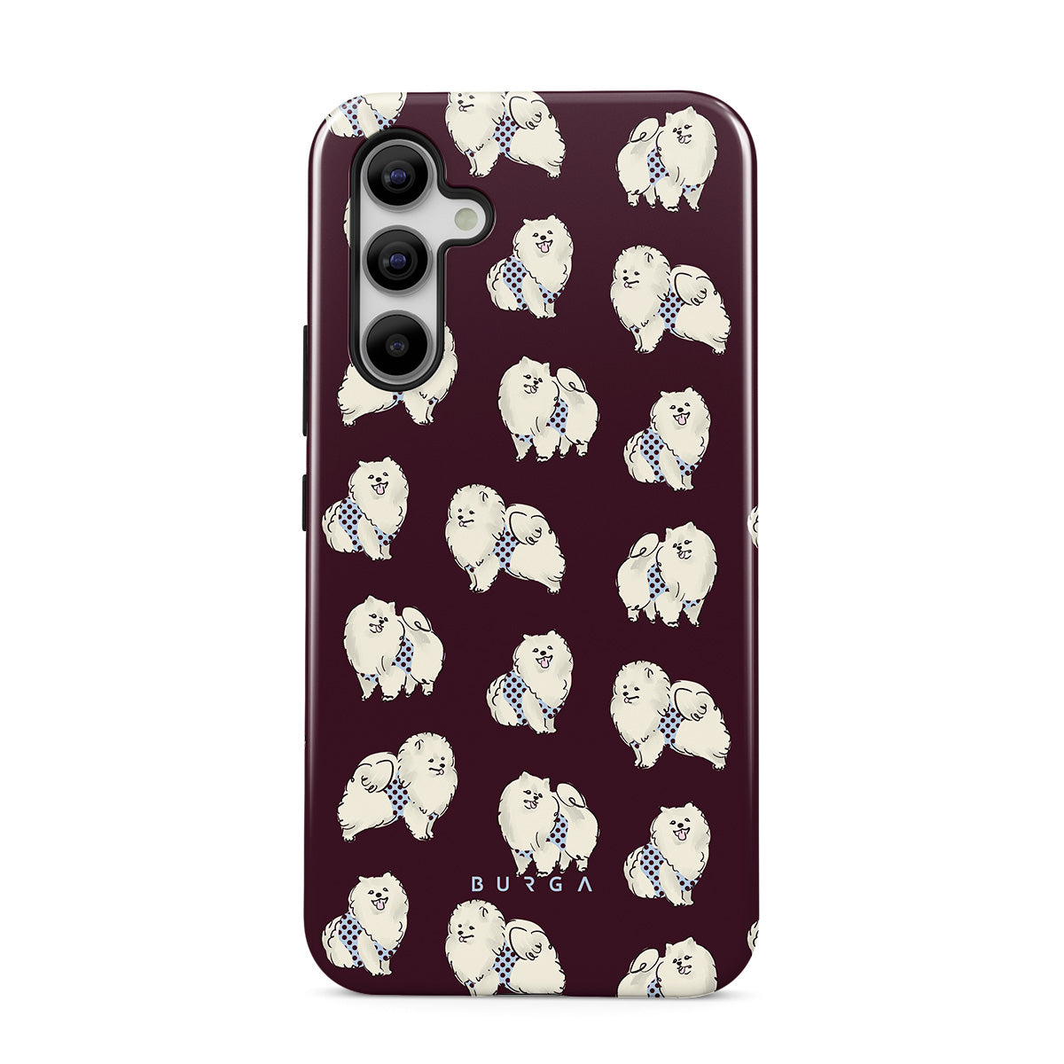 Este design contém: cães brancos fofinhos sobre um fundo bordô escuro, poodles e animais de estimação.