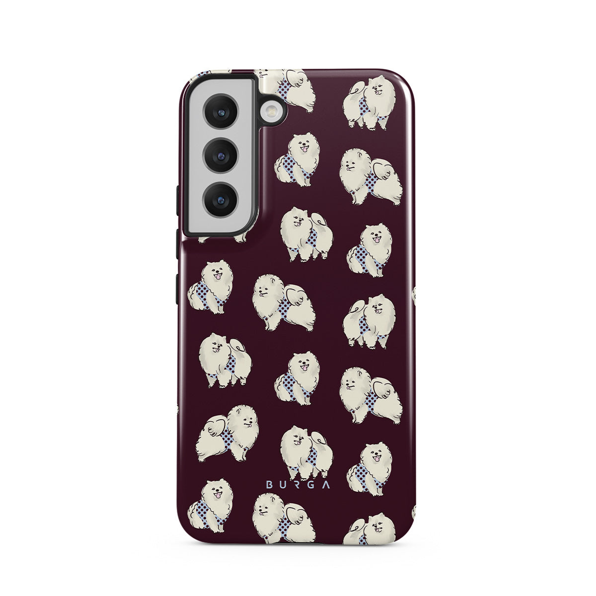 Este design contém: cães brancos fofinhos sobre um fundo bordô escuro, poodles e animais de estimação.