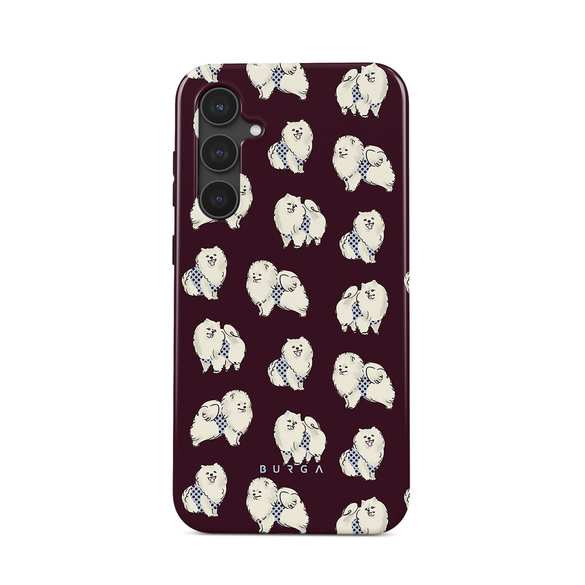 Este design contém: cães brancos fofinhos sobre um fundo bordô escuro, poodles e animais de estimação.