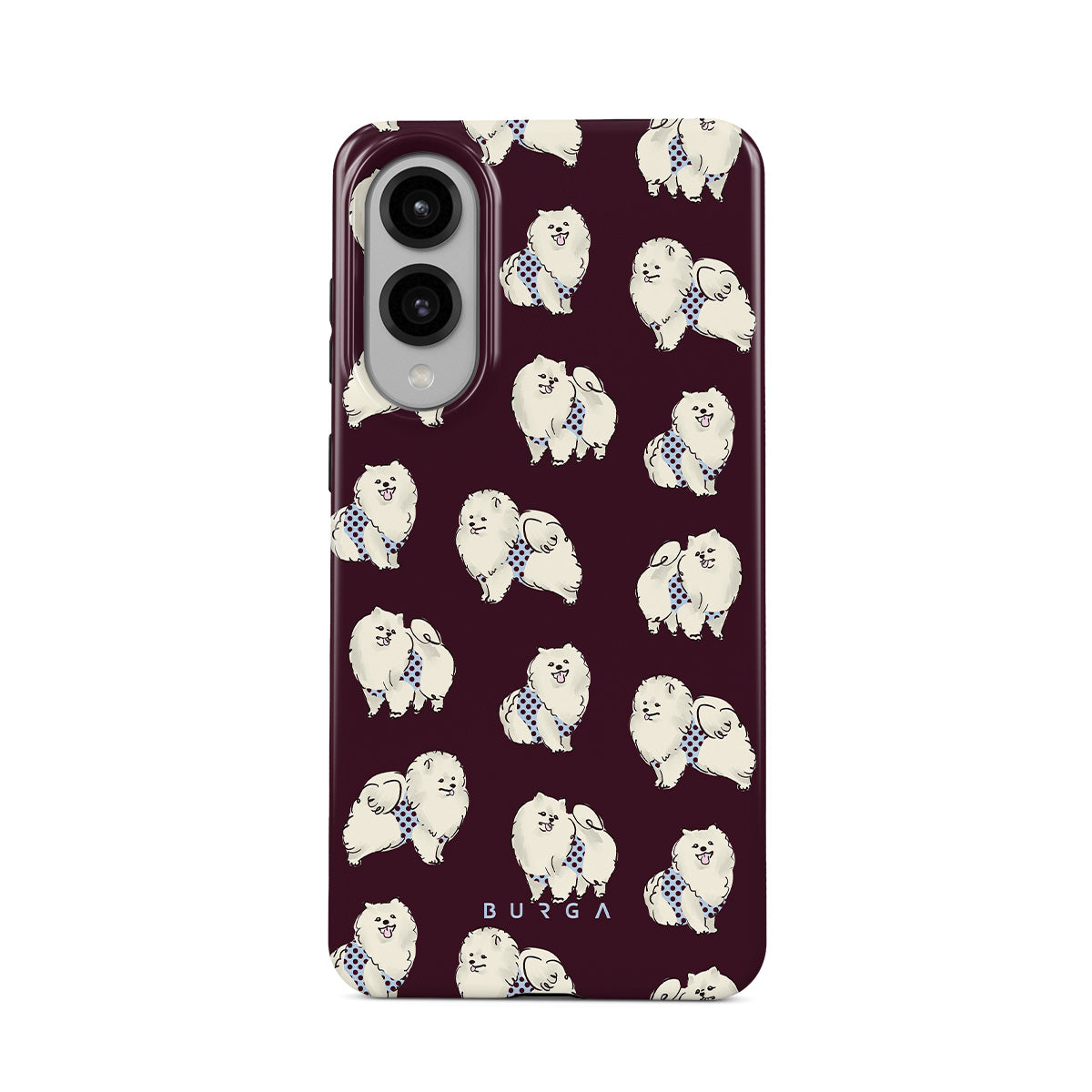 Este design contém: cães brancos fofinhos sobre um fundo bordô escuro, poodles e animais de estimação.