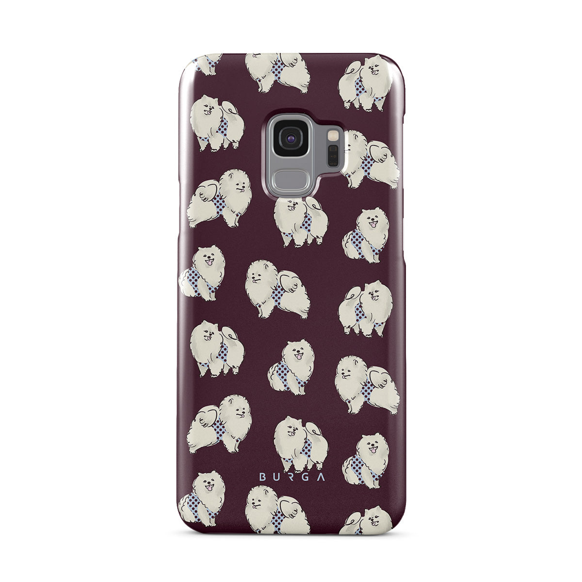 Este design contém: cães brancos fofinhos sobre um fundo bordô escuro, poodles e animais de estimação.