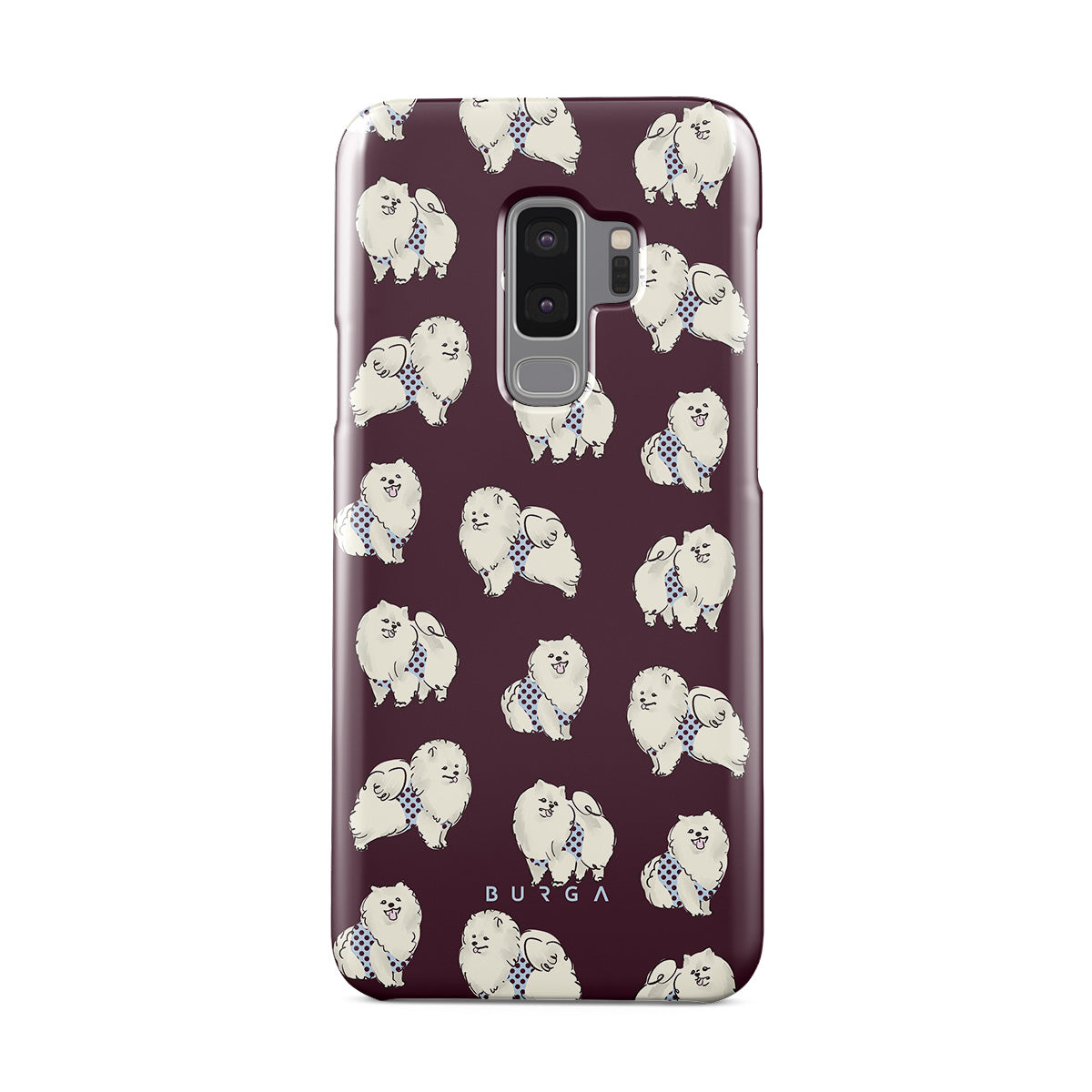 Este design contém: cães brancos fofinhos sobre um fundo bordô escuro, poodles e animais de estimação.