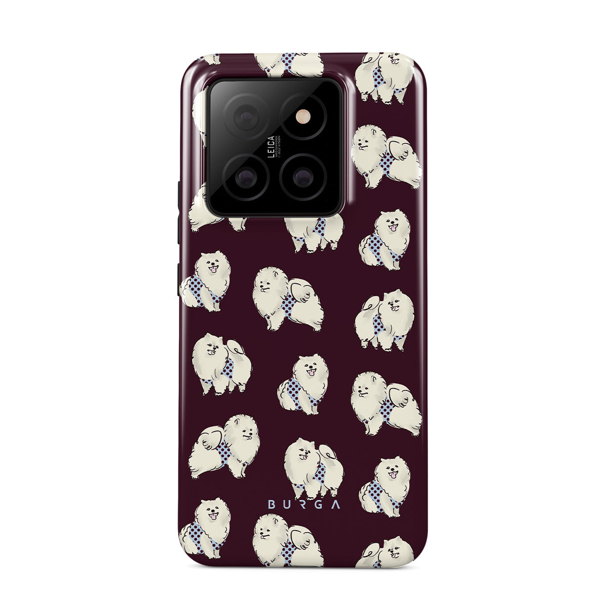 Este design contém: cães brancos fofinhos sobre um fundo bordô escuro, poodles e animais de estimação.