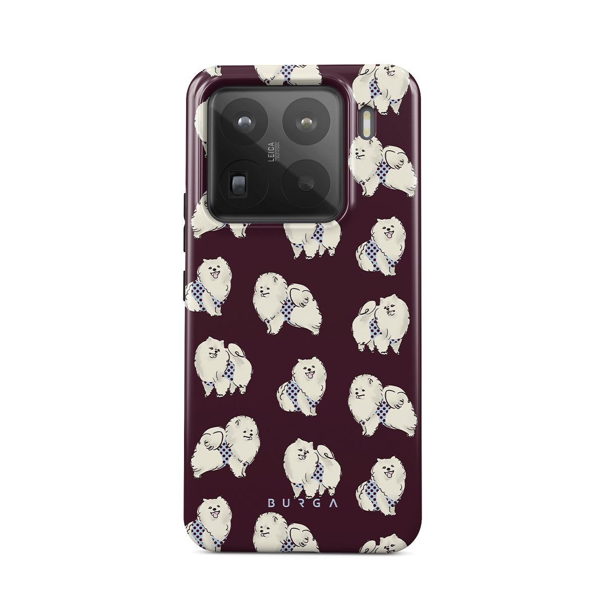 Este design contém: cães brancos fofinhos sobre um fundo bordô escuro, poodles e animais de estimação.