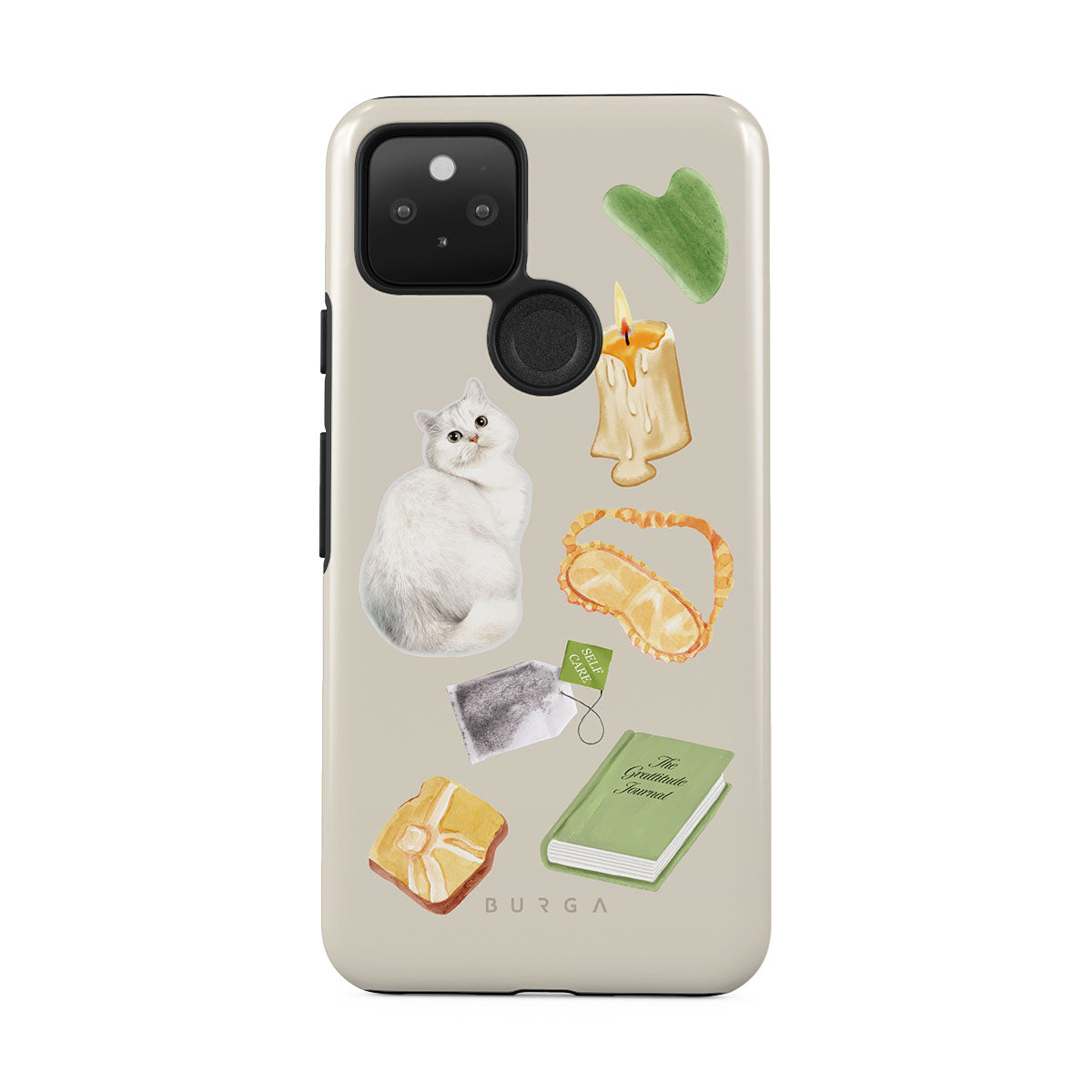 Este design contém: gato branco, livro verde, vela, pedra Gua Sha, máscara de dormir, saqueta de chá, cristal amarelo.