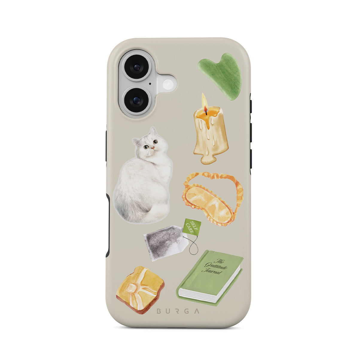 Este design contém: gato branco, livro verde, vela, pedra Gua Sha, máscara de dormir, saqueta de chá, cristal amarelo.
