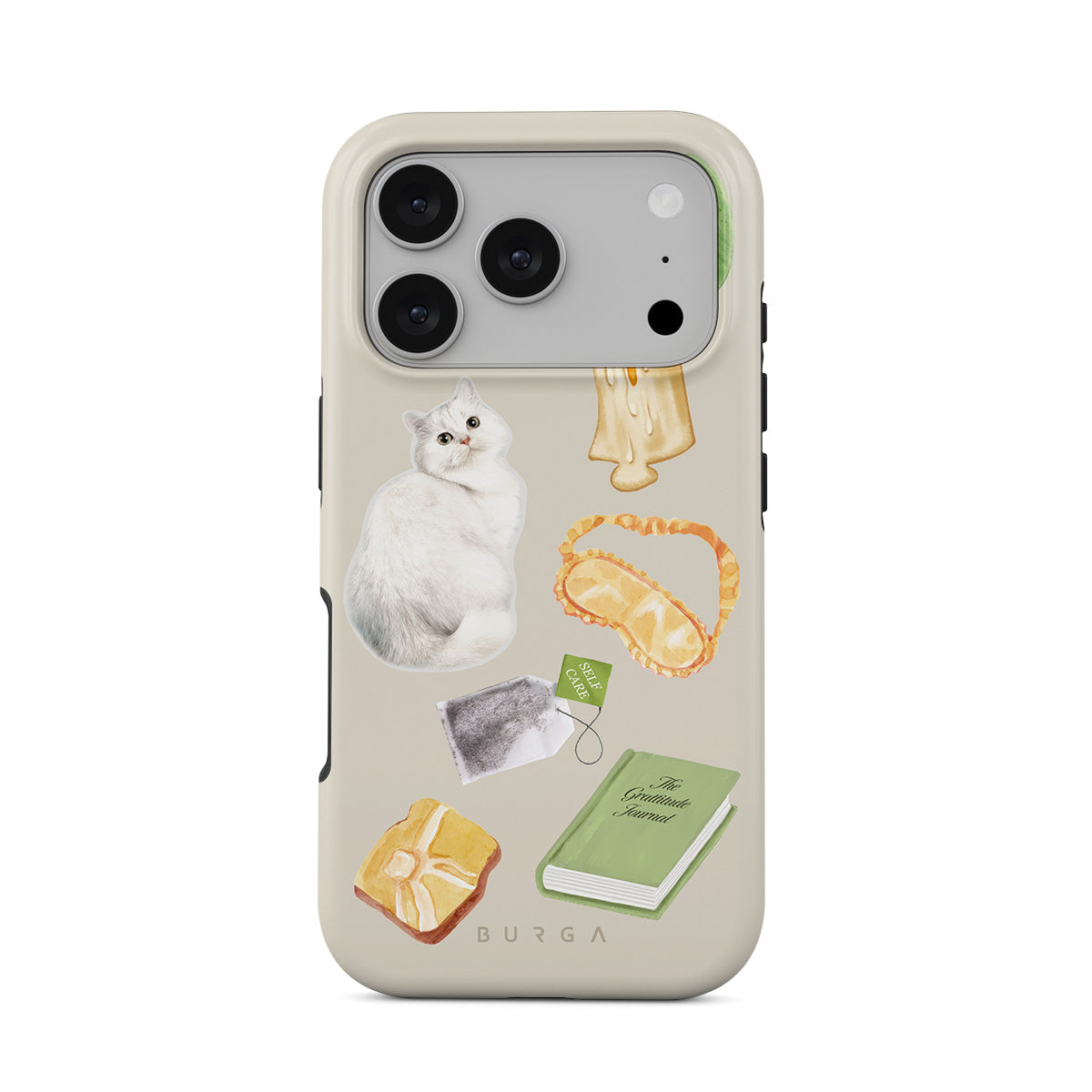 Este design contém: gato branco, livro verde, vela, pedra Gua Sha, máscara de dormir, saqueta de chá, cristal amarelo.