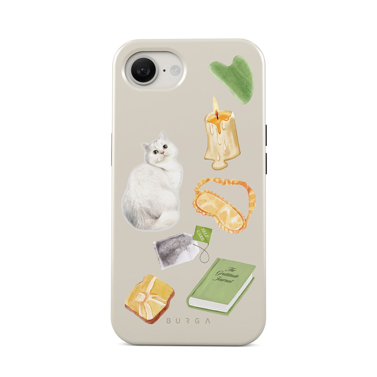 Este design contém: gato branco, livro verde, vela, pedra Gua Sha, máscara de dormir, saqueta de chá, cristal amarelo.
