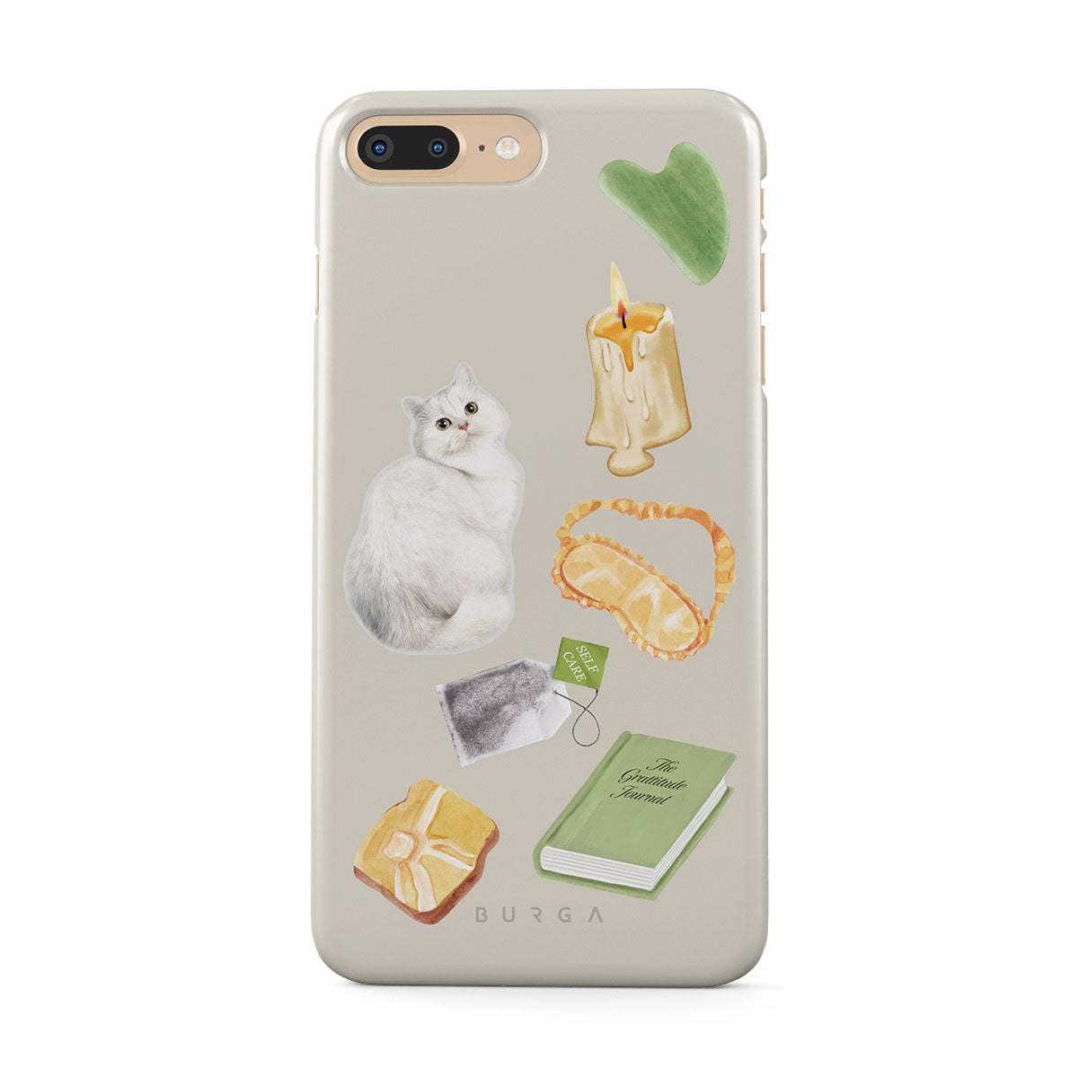 Este design contém: gato branco, livro verde, vela, pedra Gua Sha, máscara de dormir, saqueta de chá, cristal amarelo.