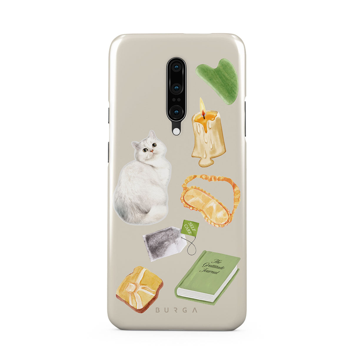 Este design contém: gato branco, livro verde, vela, pedra Gua Sha, máscara de dormir, saqueta de chá, cristal amarelo.
