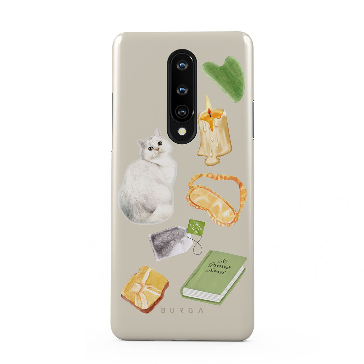 Este design contém: gato branco, livro verde, vela, pedra Gua Sha, máscara de dormir, saqueta de chá, cristal amarelo.