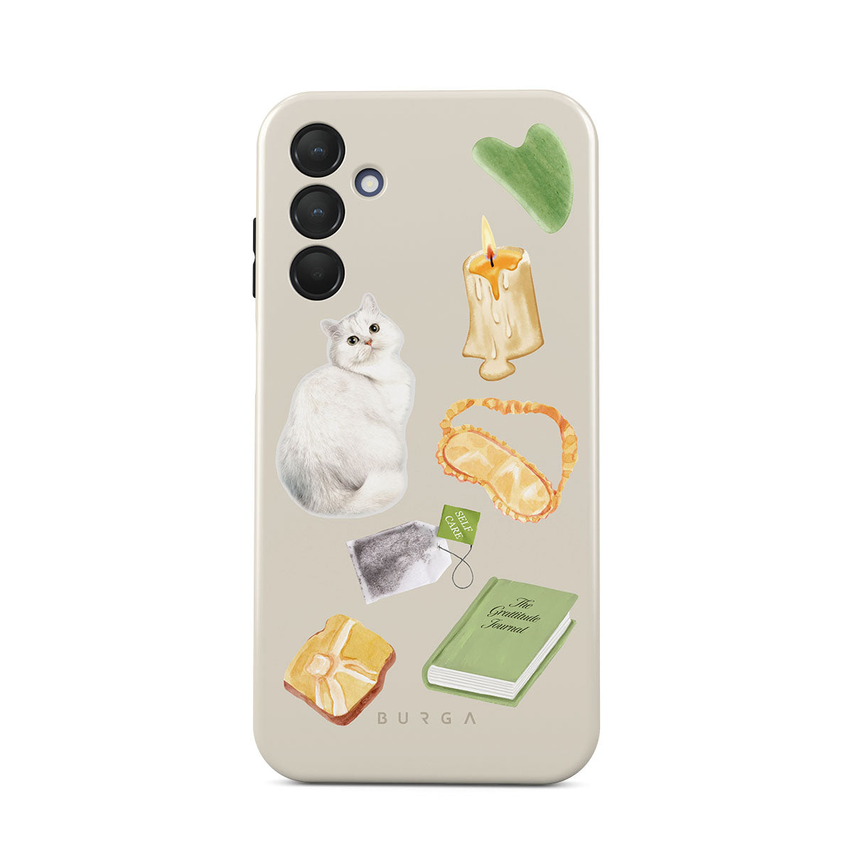 Este design contém: gato branco, livro verde, vela, pedra Gua Sha, máscara de dormir, saqueta de chá, cristal amarelo.