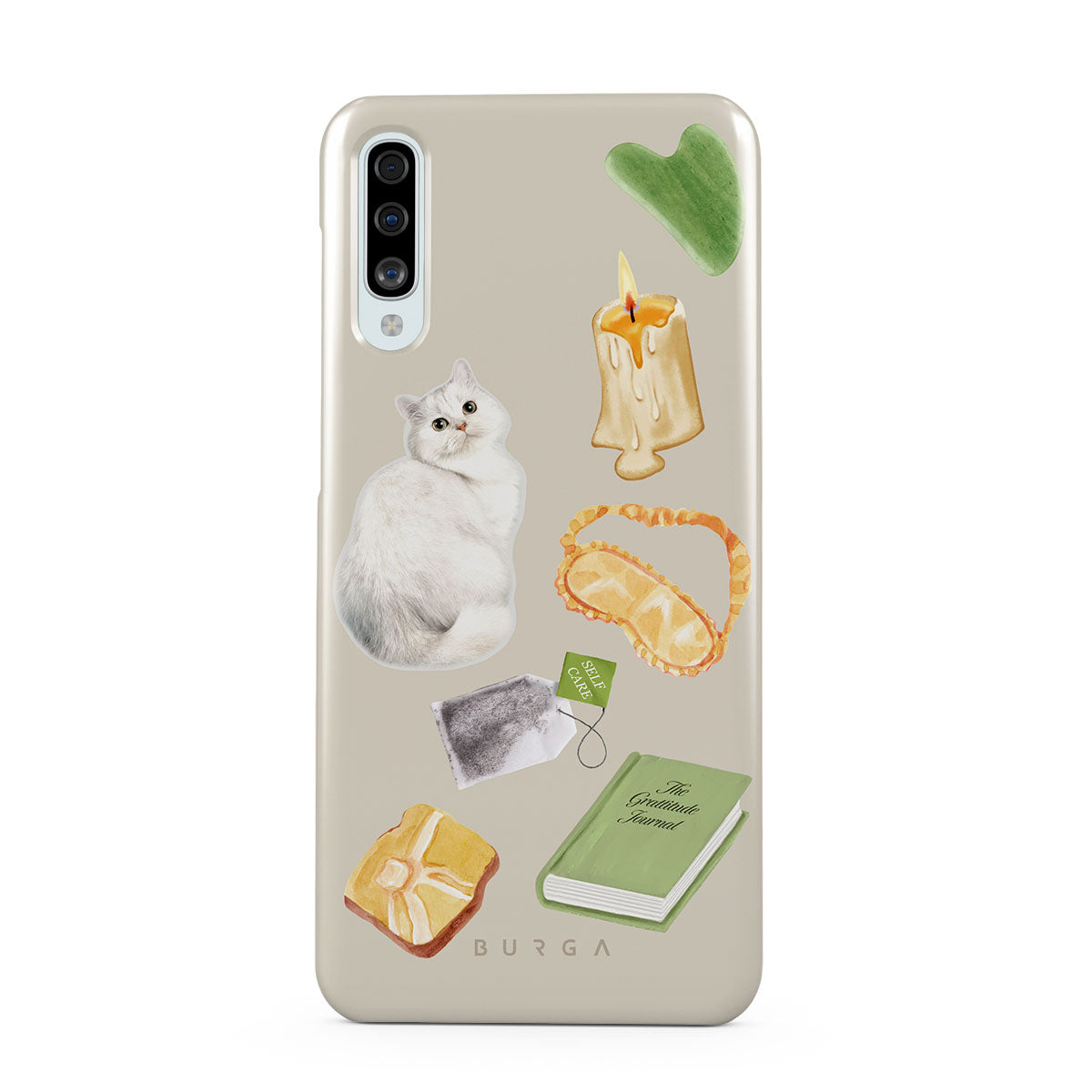 Este design contém: gato branco, livro verde, vela, pedra Gua Sha, máscara de dormir, saqueta de chá, cristal amarelo.