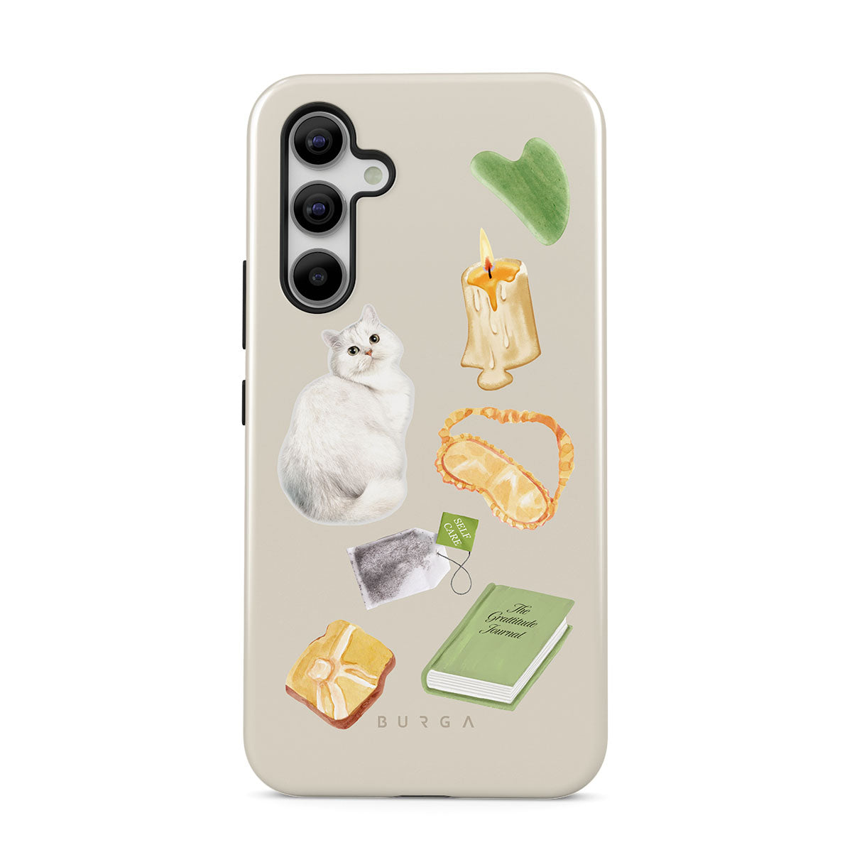Este design contém: gato branco, livro verde, vela, pedra Gua Sha, máscara de dormir, saqueta de chá, cristal amarelo.