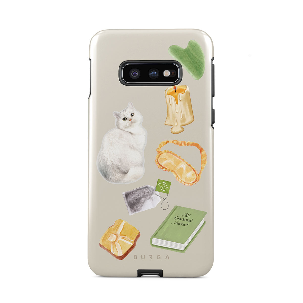 Este design contém: gato branco, livro verde, vela, pedra Gua Sha, máscara de dormir, saqueta de chá, cristal amarelo.