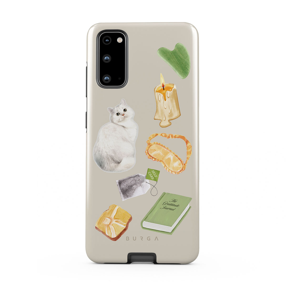 Este design contém: gato branco, livro verde, vela, pedra Gua Sha, máscara de dormir, saqueta de chá, cristal amarelo.