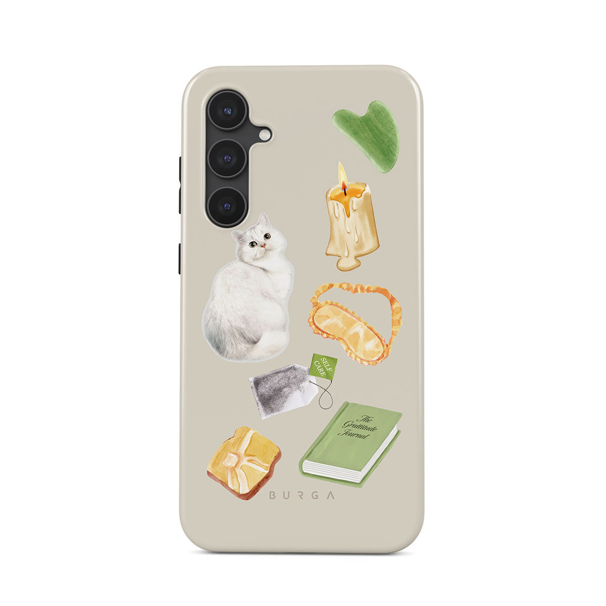 Este design contém: gato branco, livro verde, vela, pedra Gua Sha, máscara de dormir, saqueta de chá, cristal amarelo.