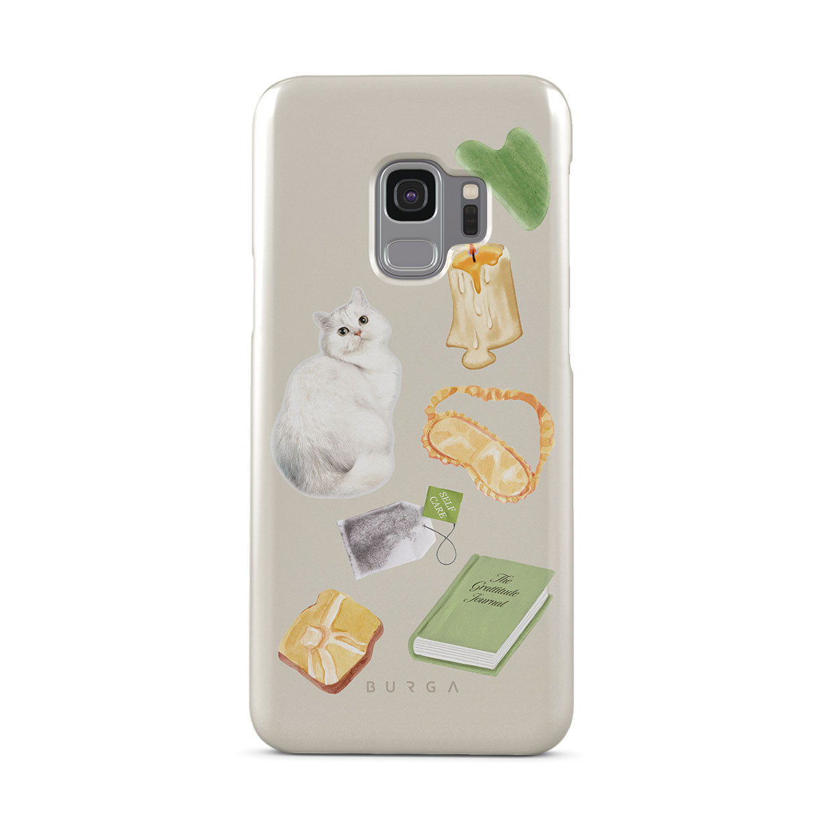 Este design contém: gato branco, livro verde, vela, pedra Gua Sha, máscara de dormir, saqueta de chá, cristal amarelo.