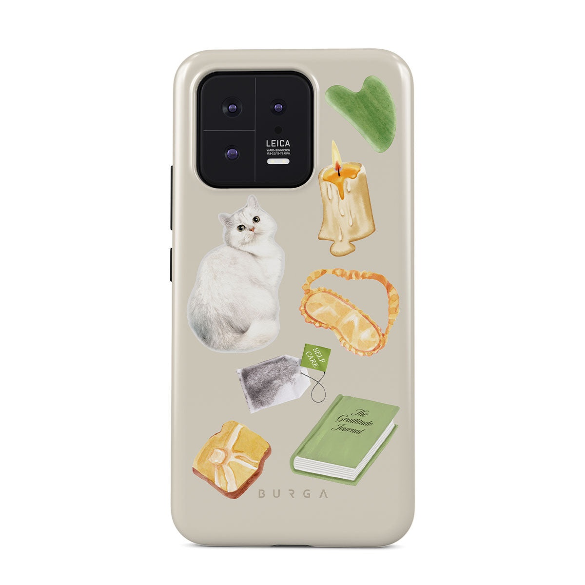 Este design contém: gato branco, livro verde, vela, pedra Gua Sha, máscara de dormir, saqueta de chá, cristal amarelo.
