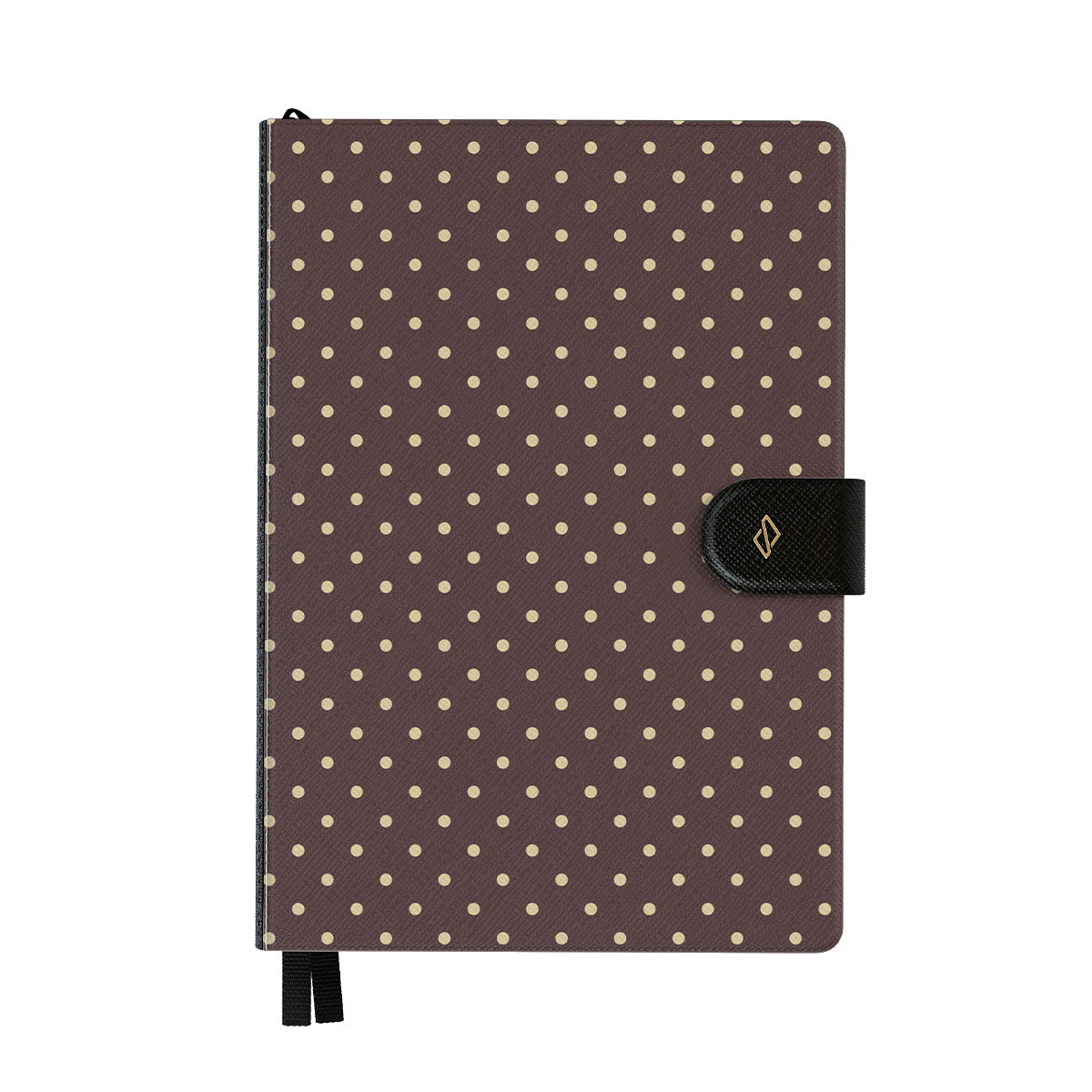 Envolvida numa elegante pele Saffiano vegana e presa com um elegante fecho magnético, é suficientemente durável para aguentar os derrames de café e os pequenos momentos desastrados da vida.