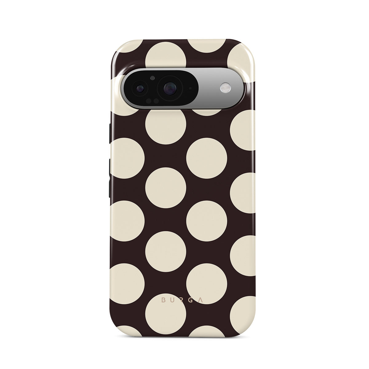 Este design contém: grandes bolinhas creme sobre fundo escuro.