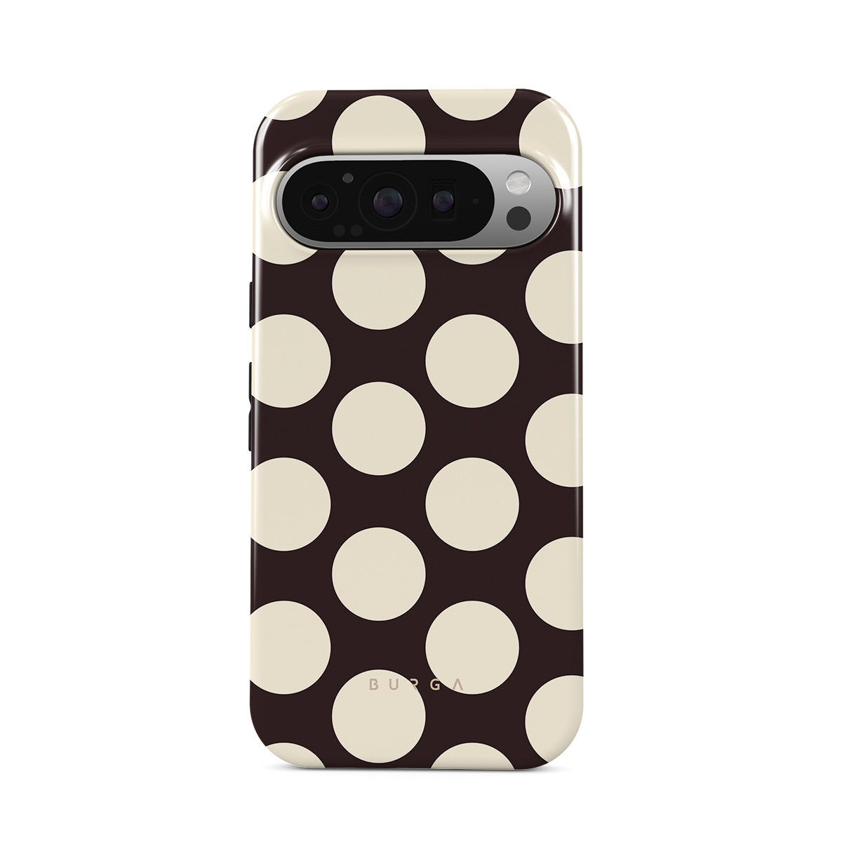 Este design contém: grandes bolinhas creme sobre fundo escuro.
